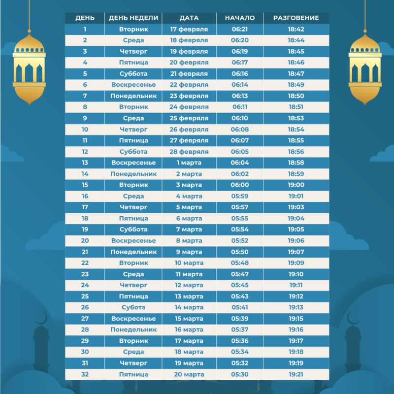 Мы подготовили детальный календарь, основанный на времени утреннего и вечернего намазов.