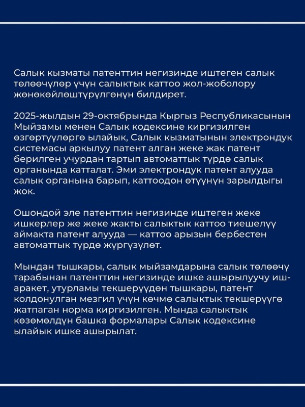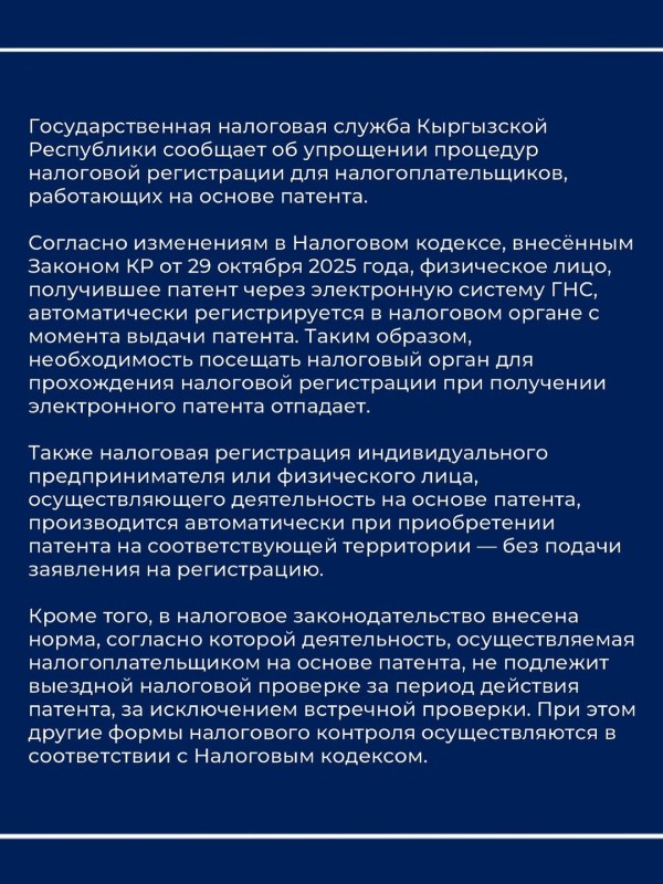 📌 Государственная налоговая служба КР сообщает об упрощении процедуры налоговой регистрации для налогоплательщиков, работающих на основе патента.