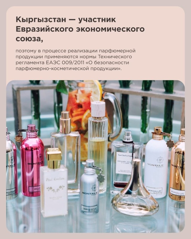 Важно помнить, что Кыргызстан входит в Евразийский экономический союз, а значит парфюмерная продукция регулируется техрегламентом ЕАЭС 009/2011