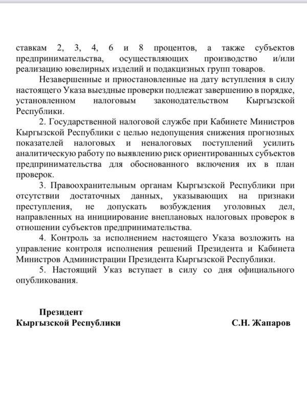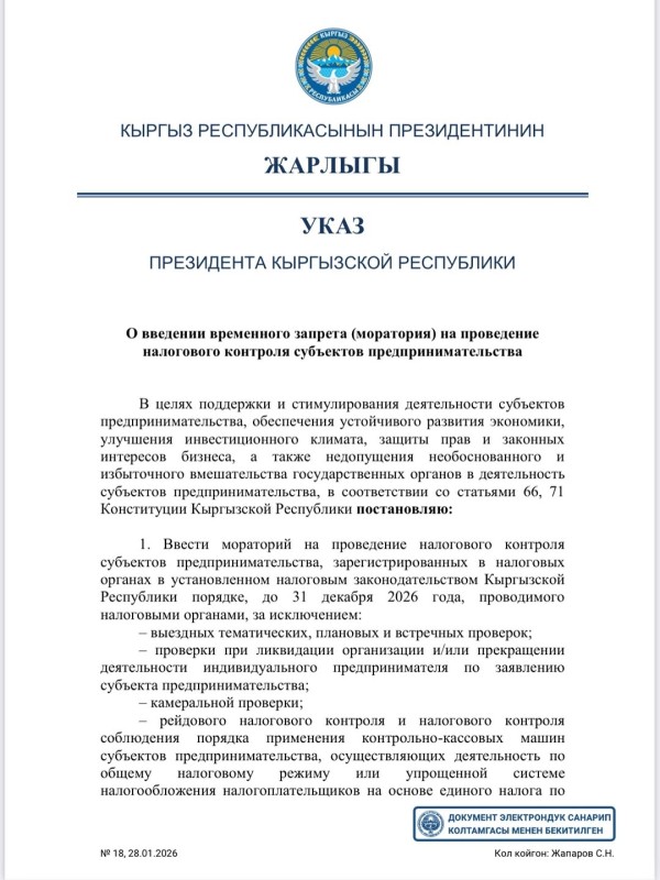 Президент Кыргызской Республики Садыр Жапаров 28 января подписал указ о введении временного запрета (моратория) на проведение налогового контроля субъектов предпринимательства.