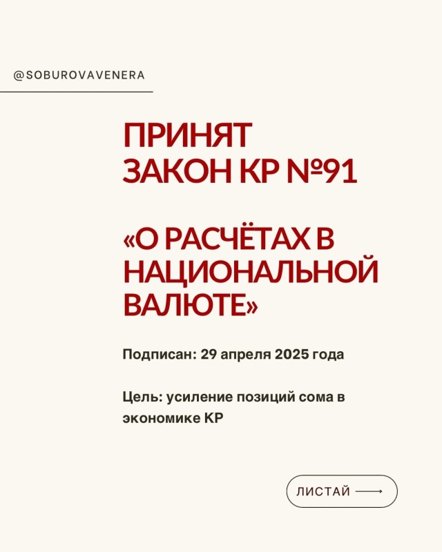 29 апреля 2025 года Президент КР подписал Закон № 91 "О расчетах в национальной валюте Кыргызской Республики". Целью Закона является повышение использования национальной валюты Кыргызской Республики - сома при осуществлении расчетов за товары, работы и услуги на территории Кыргызской Республики.