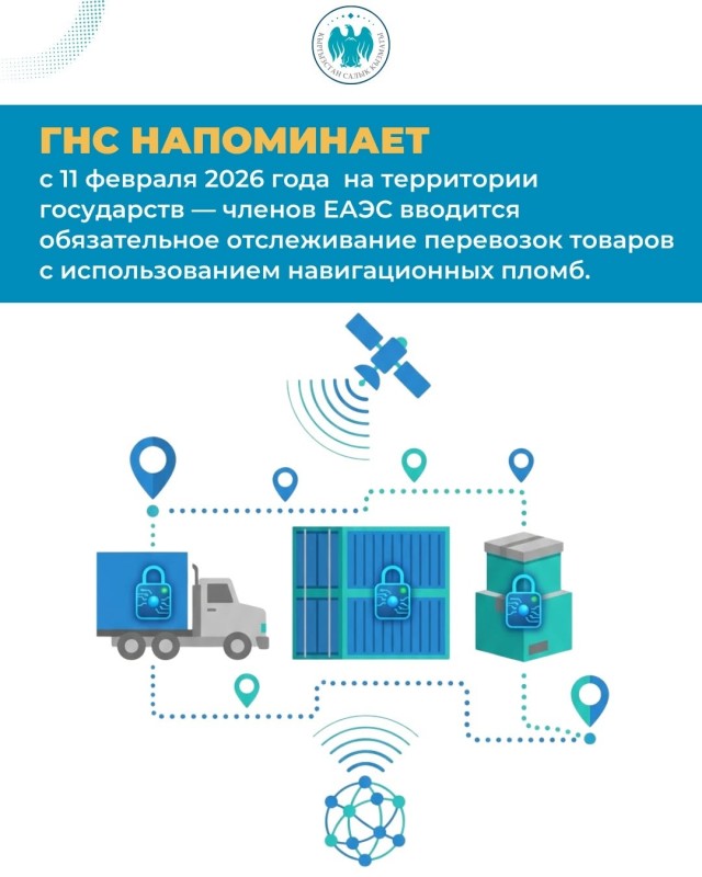 📢 ГНС напоминает, что с 11 февраля 2026 года на территории государств — членов Евразийского экономического союза вводится обязательное отслеживание перевозок товаров с использованием навигационных пломб.