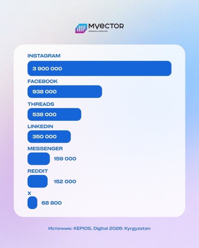 По данным Digital 2026: Kyrgyzstan, самым массовым социальным сервисом в стране остается Instagram. Потенциальный рекламный охват Instagram оценивается в 3,9 млн пользователей, что эквивалентно 53,3% населения Кыргызстана.