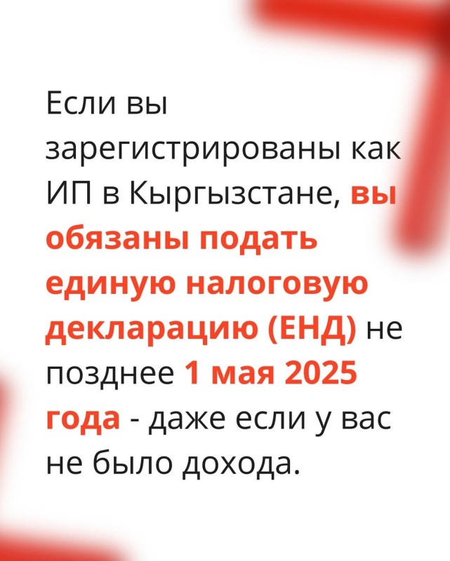 Если вы зарегистрированы как ИП в Кыргызстане, вы обязаны подать единую налоговую декларацию (ЕНД) не позднее 1 мая 2025 года — даже если у вас не было дохода.