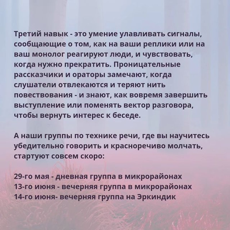 Некоторые разговорчивые люди склонны считать себя классными рассказчиками и блестящими ораторами. Однако нередко им не хватает нескольких элементарных навыков, которые помогли бы им по-настоящему увлечь их собеседников. Это три ключевых навыка (можете считать их секретными ингредиентами успешного диалога или монолога), о которых мы говорим на нашем курсе.