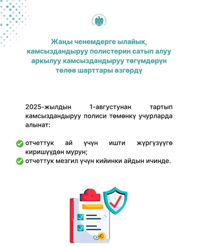 🔷 Жаңы ченемдерге ылайык, камсыздандыруу полистерин сатып алуу аркылуу камсыздандыруу төгүмдөрүн төлөө шарттары өзгөрдү.