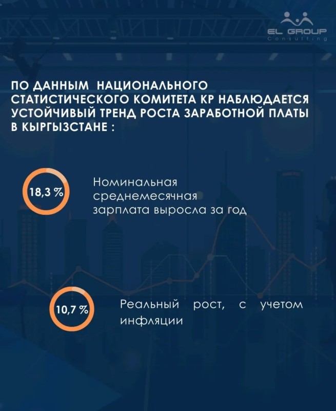 🔸Значительный рост заработной платы: По данным Национального статистического комитета КР, наблюдается устойчивый тренд роста заработной платы в Кыргызстане. Номинальная среднемесячная зарплата выросла за год на 18,3%. Реальный рост, с учетом инфляции, составил 10,7%.
