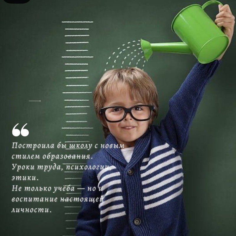 Я бы построила школу. Не обычную, а с новым стилем образования: где есть уроки труда, психологии и этики. Где учат быть личностью, а не просто сдавать экзамены.