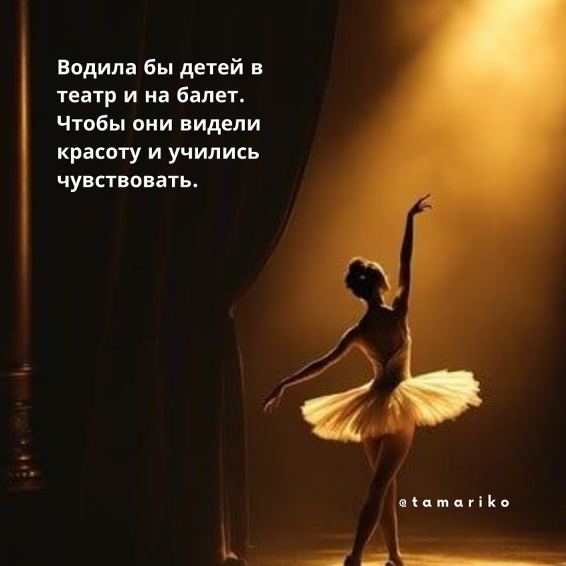 Я бы водила детей в театр и на балет. Чтобы они с детства учились видеть красоту, чувствовать и вдохновляться.