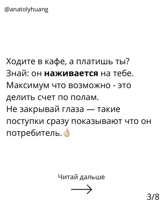 Не закрывайте глаза на такие «мелочи». Сегодня вы платите за кофе, завтра — за его жизнь. Уважайте себя и выбирайте рядом мужчину, который сам гордится тем, что обеспечивает свою женщину.