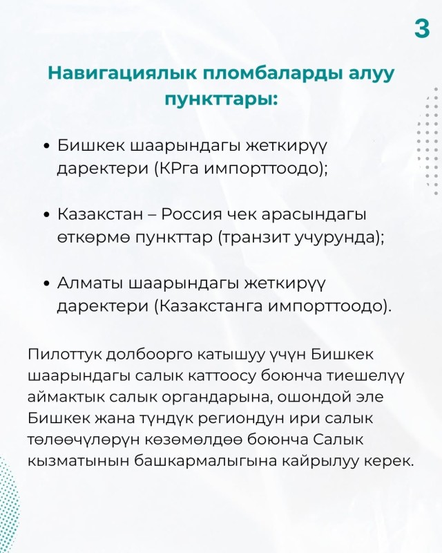 📢Мамлекеттик салык кызматы Кыргыз Республикасы менен Казакстан Республикасынын ортосундагы автомобилдик ташууларда навигациялык пломбаларды колдонуу боюнча пилоттук долбоорду ишке киргизүүдө.