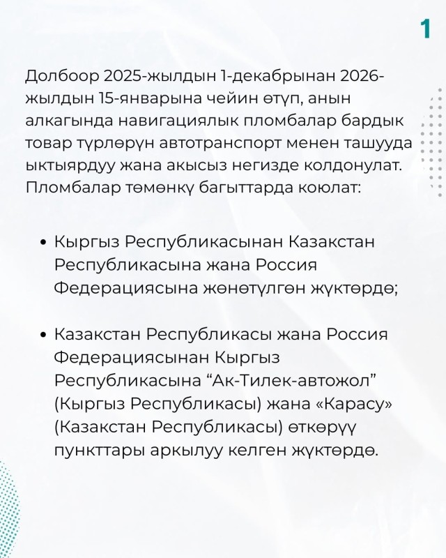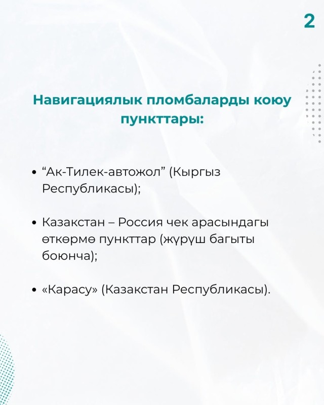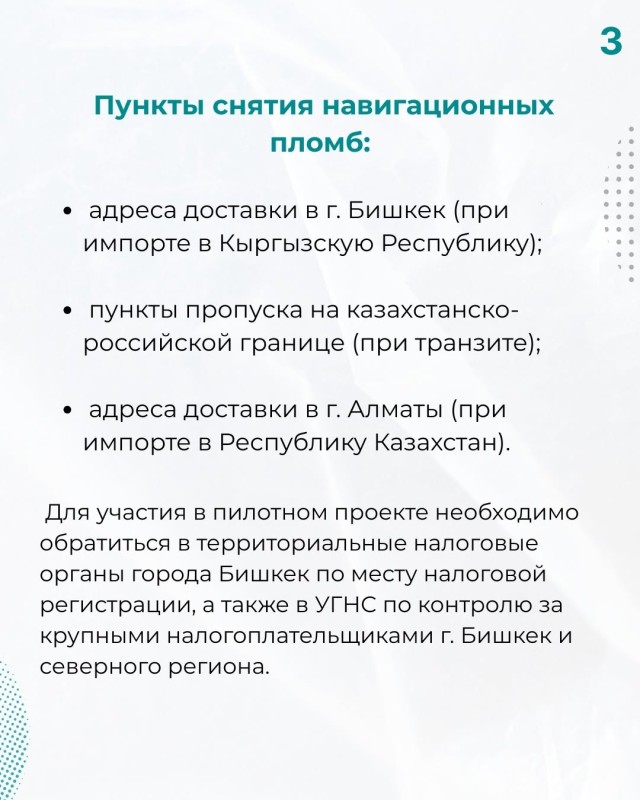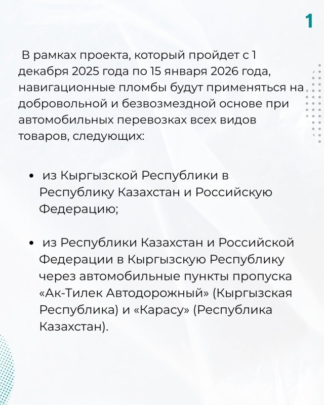 📢Государственная налоговая служба Кыргызской Республики запускает пилотный проект по применению навигационных пломб при автомобильных перевозках между Кыргызской Республикой и Республикой Казахстан.