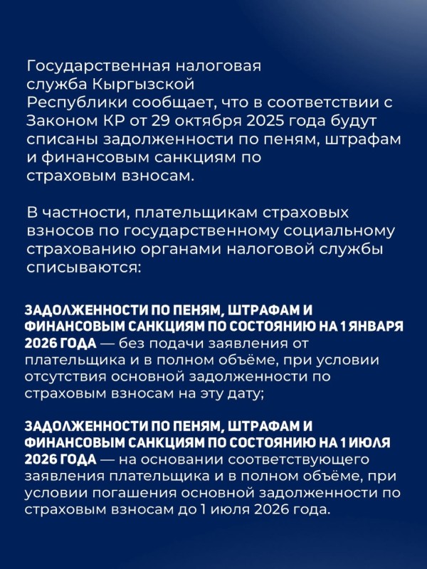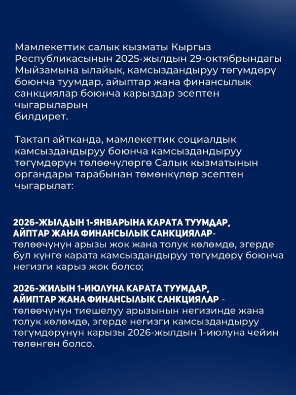 ✅ Камсыздандыруу төгүмдөрү боюнча карыздарды эсептен чыгарууга мүмкүнчүлүк берилди.