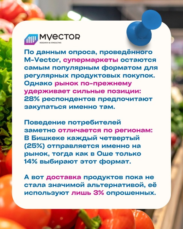 По данным опроса, проведённого M-Vector на онлайн-панели, супермаркеты остаются самым популярным форматом для регулярных продуктовых покупок. Однако рынок по-прежнему удерживает сильные позиции: 28% респондентов предпочитают закупаться именно там.