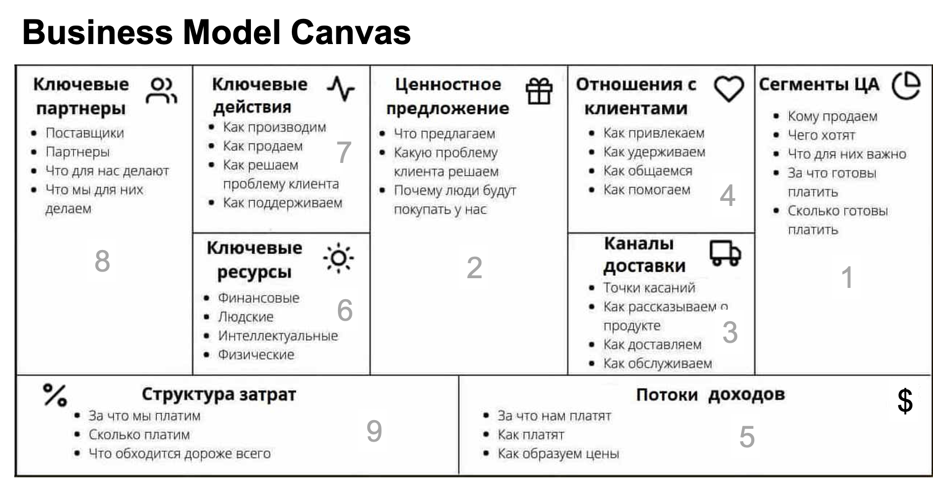 Продукт, каналы, процессы, партнёры, ресурсы.