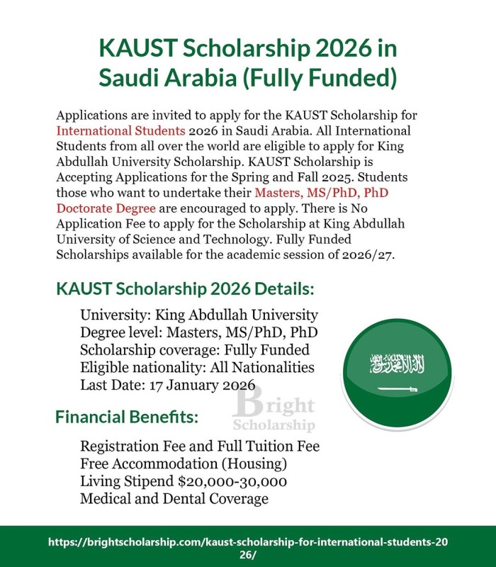 Стипендия KAUST для иностранных студентов в Саудовской Аравии, 2026 г. (полное финансирование)