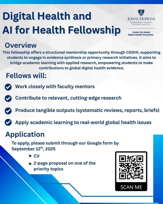 Центр глобальных инноваций в области цифрового здравоохранения при Школе общественного здравоохранения имени Блумберга при Университете Джонса Хопкинса запускает стипендию по цифровому здравоохранению и искусственному интеллекту для здравоохранения. Приём заявок открыт только для студентов BSPH.