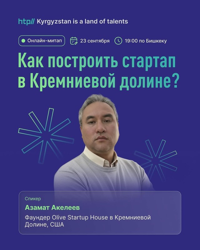 Присоединяйся к онлайн-сессии с Азаматом Акелеевым, который расскажет о программе Dive into Silicon Valley — 🌉 мосте между кыргызскими стартапами и мировой инновационной экосистемой! 🌍