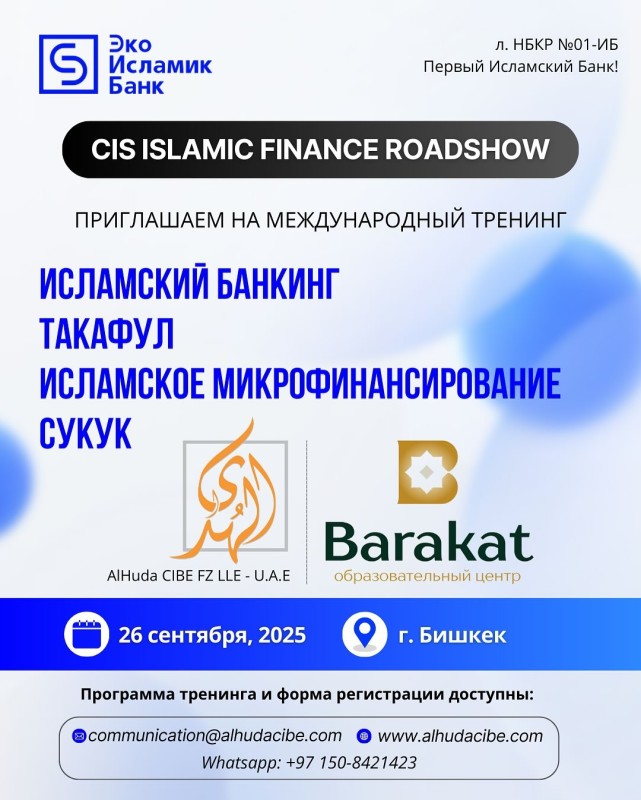 26 сентября 2025 года в Бишкеке состоится специализированный тренинг «Операционные и практические аспекты Исламского банкинга, Такафула, Исламского микрофинансирования и Сукука». Обучение проведут международно-признанные эксперты AlHuda CIBE (ОАЭ, Дубай).