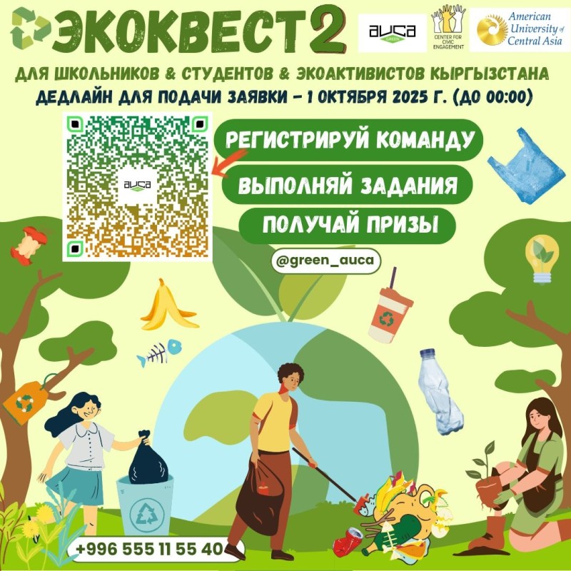 Дополнительная информация по тел.: +996 555 11 55 40 (звонить и W/A), Маргарита Лазуткина, координатор программы «Зеленый АУЦА», координатор экоквеста