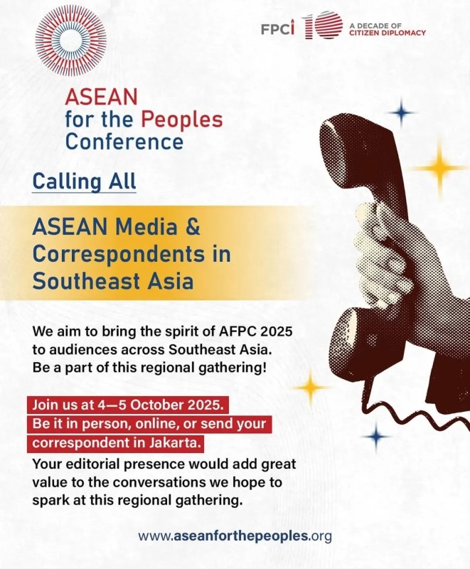 #AFPC2025 will be held on 4-5 October 2025 and aims to realise a people-centered ASEAN. With your editorial presence, we hope to bring the spirit of #ASEANForThePeoples to audiences across Southeast Asia. For more information and details, please contact our Media Associate, Wira, via email at wira@fpcindonesia.org.