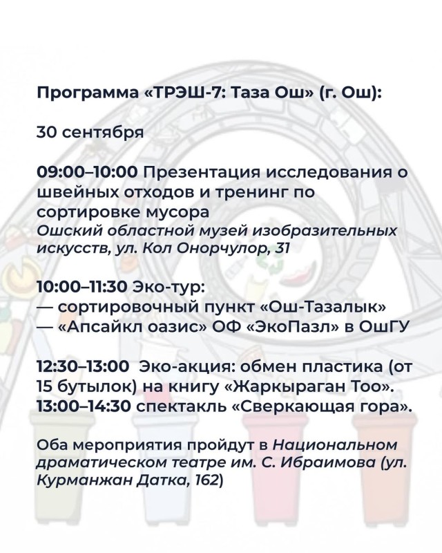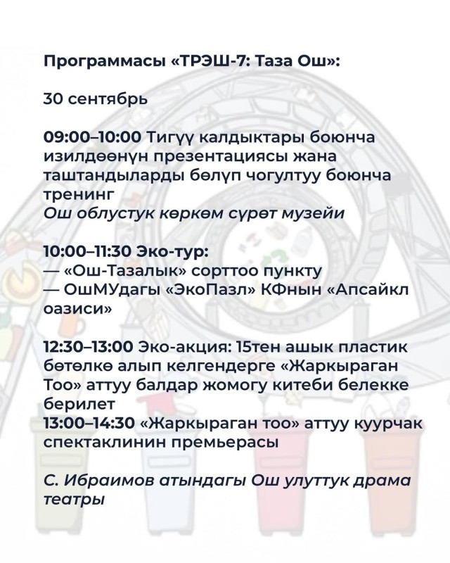 30 сентября в городе Ош пройдёт эко-арт-фестиваль «TRASH-7: Чистый Ош».