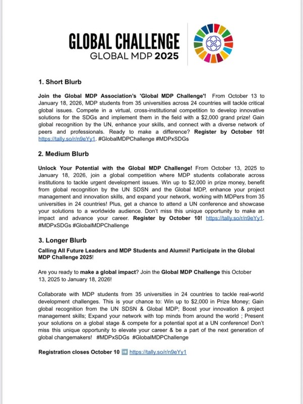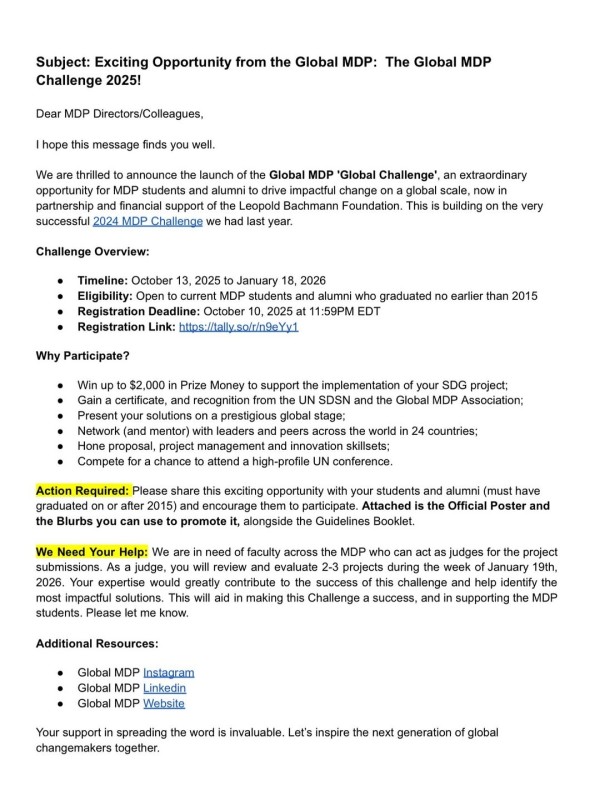 Мы рады объявить о запуске программы «Глобальный вызов» (Global Challenge) – уникальной возможности для студентов и выпускников MDP добиться значительных изменений в глобальном масштабе. Программа реализуется при поддержке Фонда Леопольда Бахмана и при его финансовой поддержке. Она является продолжением очень успешного прошлогоднего конкурса MDP 2024.