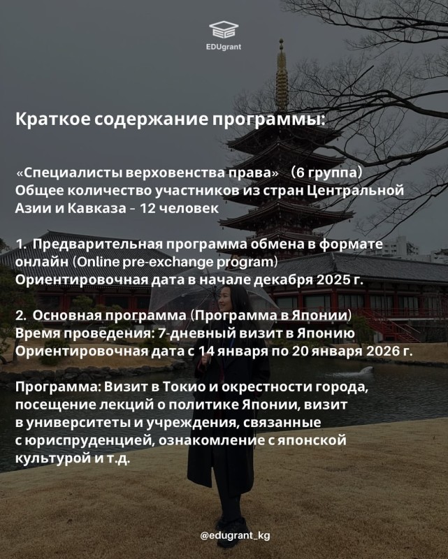 В рамках Программы «MIRAI-2025» Министерство иностранных дел Японии приглашает лучших молодых специалистов из Центральной Азии и Кавказа. Это та программа, по которой я ездила в Японию в 2024 году.