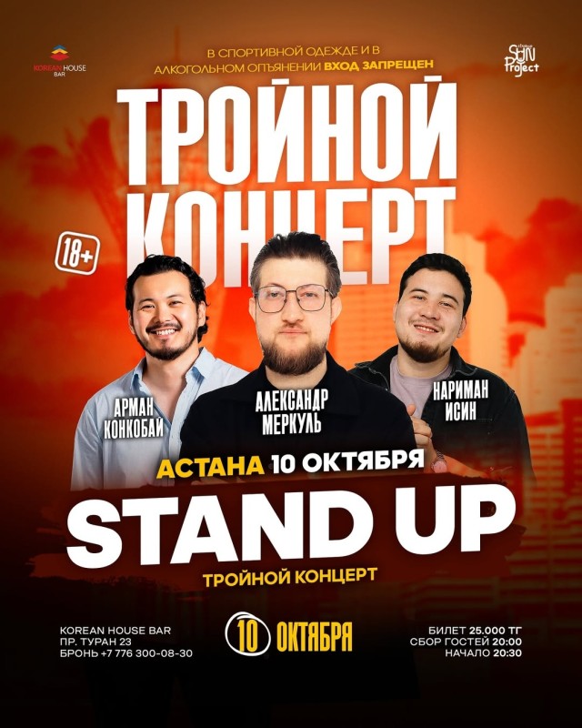 ТРОЙНОЙ СТЕНДАП В ПЯТНИЦУ, 10 ОКТЯБРЯ, в Астане - новые и лучшие шутки от резидентов @sunprojectkz : Александра Меркуля @merkul_standup , Наримана Исина @issin_nariman и Армана Конкобая @qonqobay