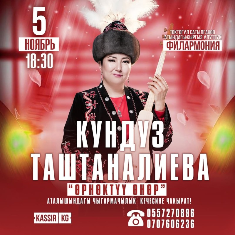 Дорогие великие люди, любящие искусство! В бурный осенний день Кундуз Таштаналиева, любимая дочь нашего народа, прокладывающая свой путь в искусстве, приглашает вас на творческий вечер «Образцовое искусство» 5 ноября в 18:30!