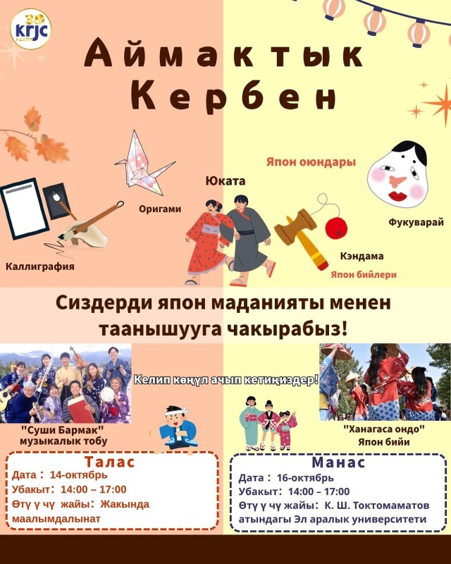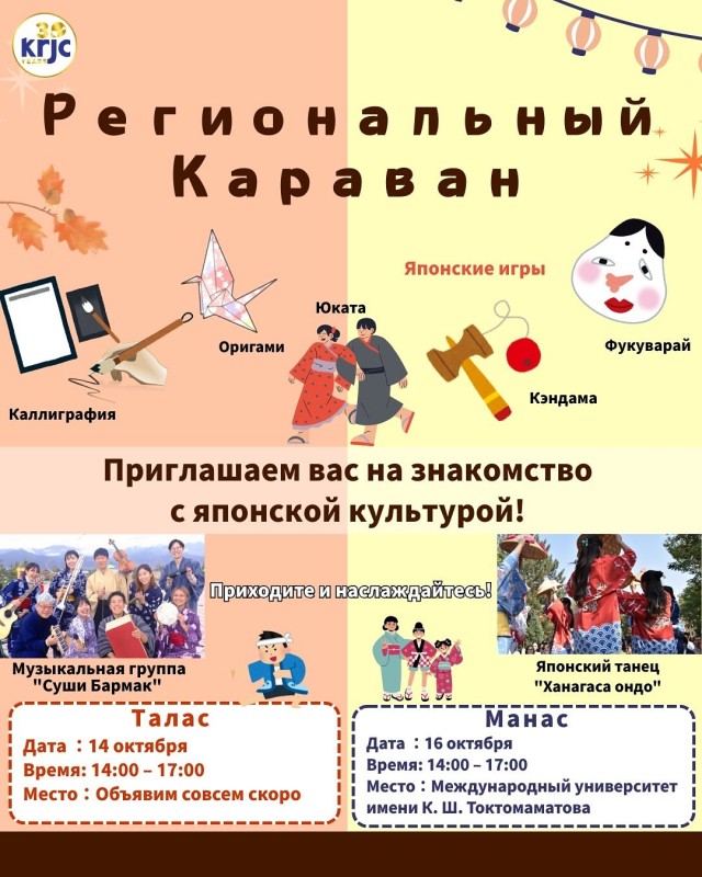 Сиздерге кызыктуу иш-чара «Аймактык кербен: Япон маданияты менен таанышуу жана Бизнес баарлашуу» баштала турганын маалымдайбыз! 🌏🤝