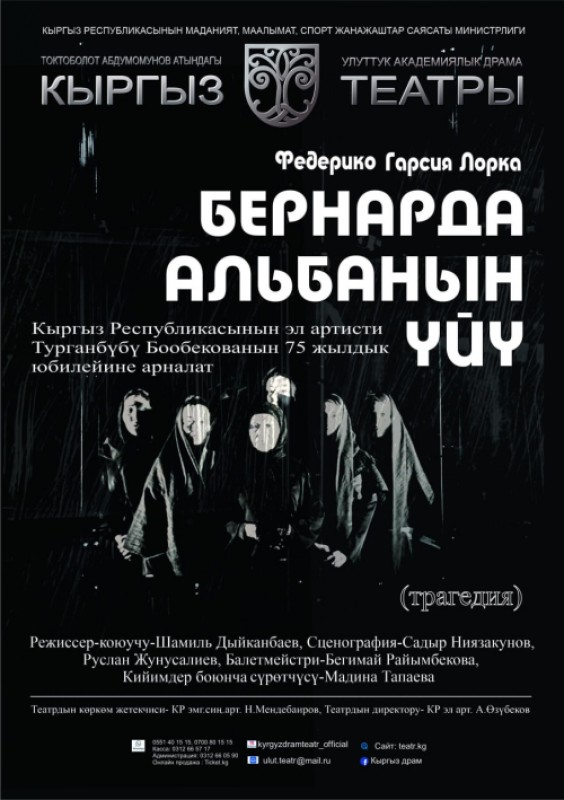 Спектаклде патриархалдык коомдогу байыртадан келе жаткан “8 жыл бою аза күтүү” салтын катуу сактаган жана гендердик теңсиздик көз карашта тарбияланып, аны бекем карманган жесир аял Бернарда Альба тууралуу баяндалат. Бернарда 5 кыз жана акылынан айныган энесин баккан, теги ак сөөк, эрки күчтүү аял. Ал кыздарынын да салтты бекем кармоо менен анын эркинен чыкпоолорун күч менен талап кылат.