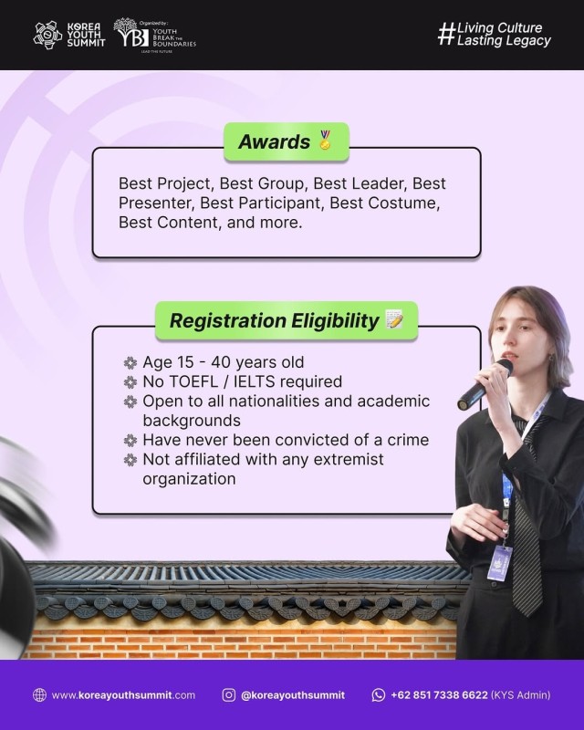 Step into the Korea Youth Summit, proudly organized by Youth Break the Boundaries (YBB Foundation), carrying the vision of #LivingCultureLastingLegacy.