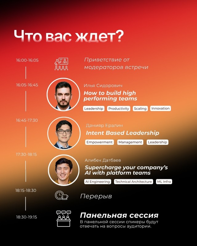 🤝 Шара соңында барлық спикерлердің қатысуымен болатын панельдік сессия өтеді, онда сіз көшбасшылық, команда және технологиялардың болашағы туралы маңызды сұрақтарға нақты жауаптар аласыз.