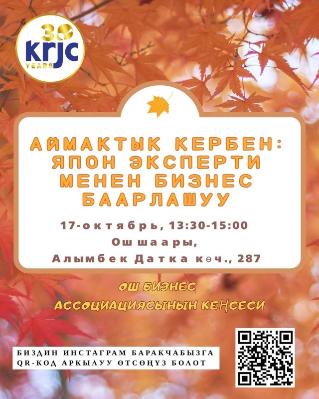 Ошол себептен Ош Бизнес Ассоциациясынын мүчөлөрүн, бизнес өкүлдөрүн, ишкерлерин *япон эксперти менен боло турган «Ош бизнес баарлашуусуна»* чакырабыз 💬