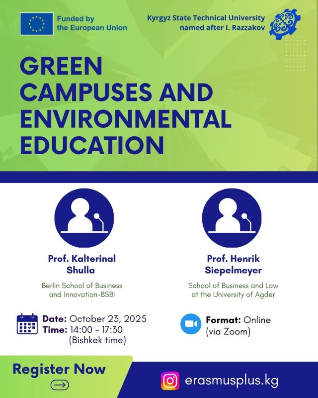 Университет өкүлдөрүн, окутуучуларды, студенттерди жана туруктуу өнүгүүгө кызыккандарды Жашыл кампустар жана экологиялык билим берүү темасындагы онлайн-семинарга чакырабыз.