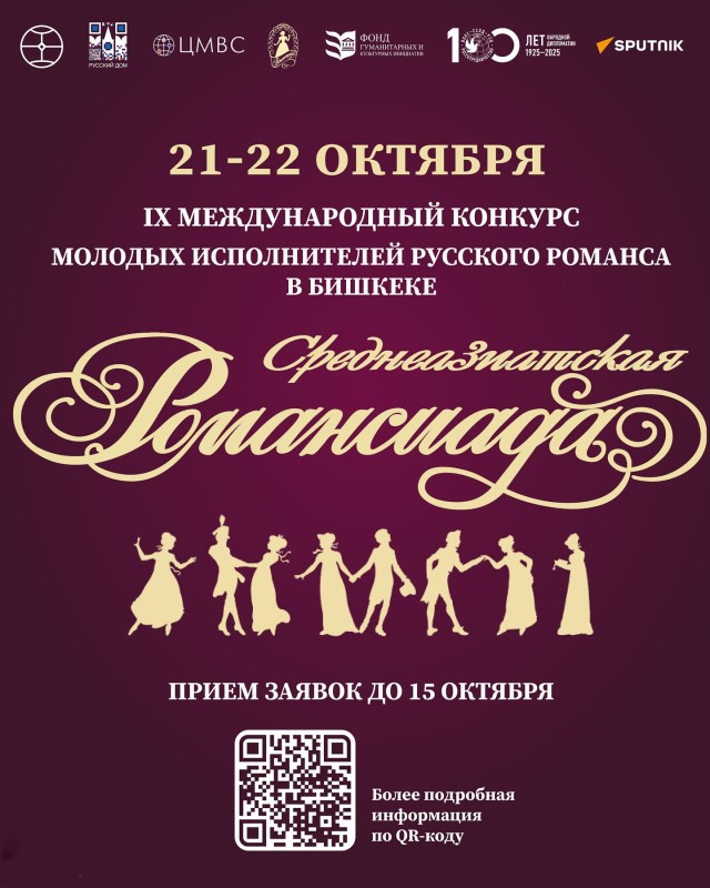 📆 21-22 октября в Бишкеке состоится IX Международный конкурс молодых исполнителей русского романса «Среднеазиатская Романсиада». Конкурс включен в программу XXIX Международного конкурса молодых исполнителей русского романса «Романсиада-2025». Победители примут участие в финале «Романсиады» в декабре 2025 года в Москве.