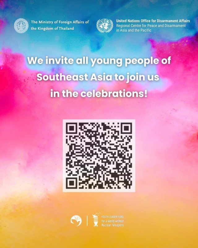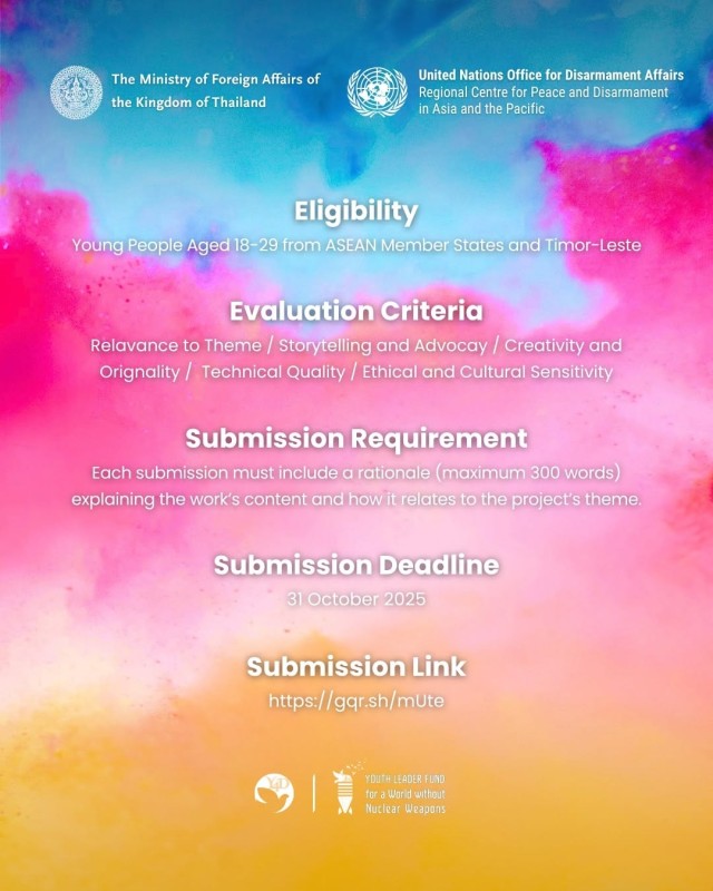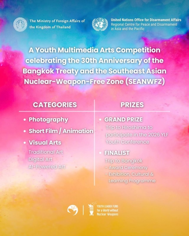 In celebration of the 30th Anniversary of the Bangkok Treaty (1995), which established the Southeast Asian Nuclear-Weapon-Free Zone (SEANWFZ), the Ministry of Foreign Affairs, Kingdom of Thailand @mfa_thailand and United Nations Regional Centre for Peace and Disarmament in Asia and the Pacific @unrcpd invite youth (ages 18–29) from ASEAN Member States and Timor-Leste to envision a world free from nuclear weapons through art.