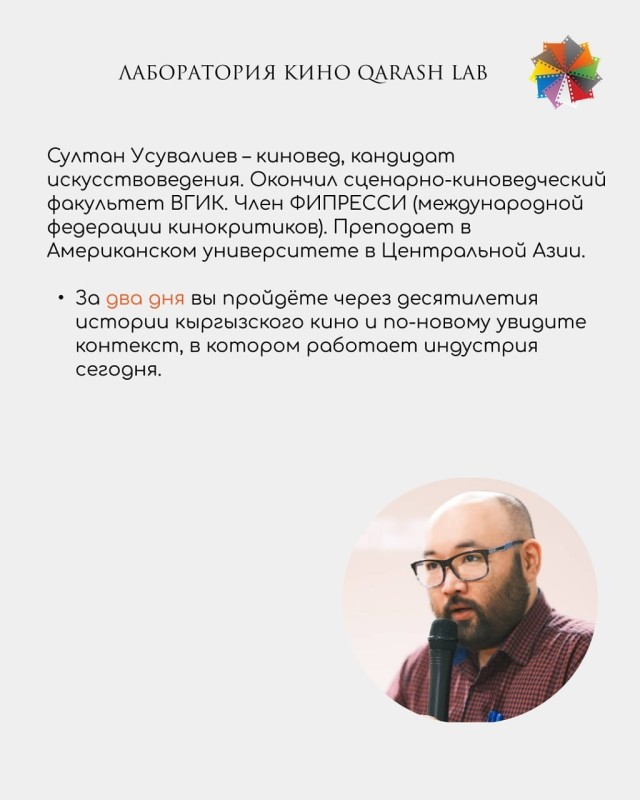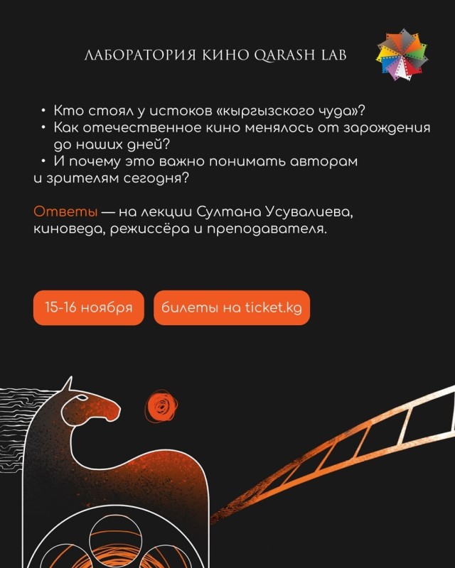 15–16 ноября вместе с киноведом, кандидатом искусствоведения и членом FIPRESCI Султаном Усувалиевым мы пройдём по ключевым вехам развития национального кинематографа и посмотрим на индустрию через призму времени.