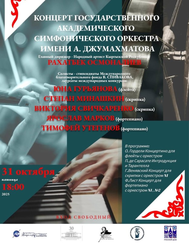 🎼 Под управлением Народного артиста Кыргызской Республики Рахатбека Осмоналиева прозвучат выдающиеся произведения мировой классики в исполнении талантливых стипендиатов Международного благотворительного фонда В. Спивакова — лауреатов международных конкурсов: