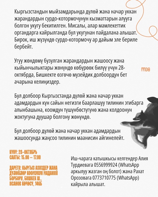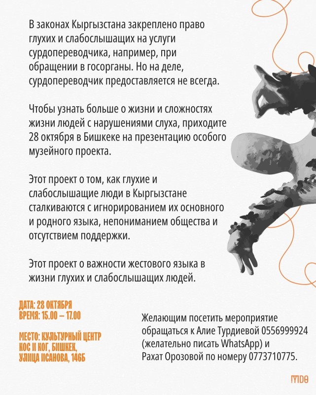 Сен бул дүйнөнү укпасаң, дүйнө сени уккусу келбесе, эмне кылыш керек? 28-октябрда дүлөй жана начар уккан адамдардын татаал турмушу жөнүндө музей долбоорунун бет ачарына баш багып келиңиздер.