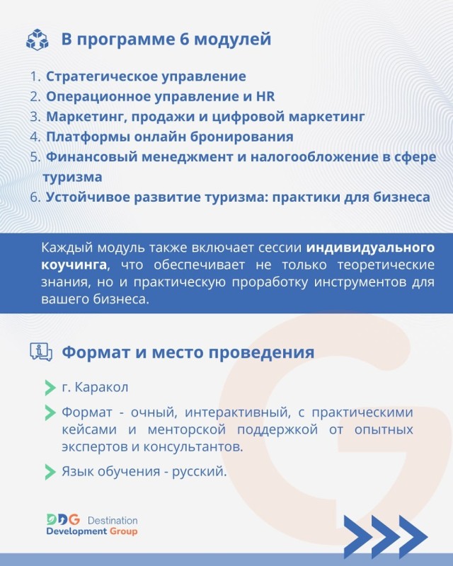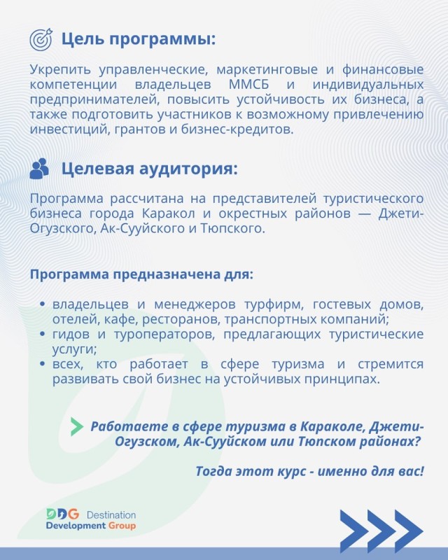 Программа реализуется при поддержке Проекта «Устойчивое развитие зимнего туризма» и предназначена для представителей турбизнеса Каракола и районов Джети-Огуз, Ак-Суу, Тюп.