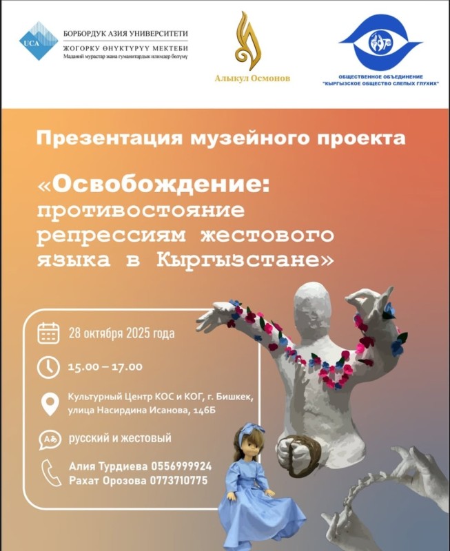 28 октября в 15:00 в Культурном центре КОС и КОГ (г. Бишкек, ул. Исанова, 146Б) состоится презентация арт-скульптуры «Освобождение», созданной на основе реальных историй глухих и слабослышащих людей.