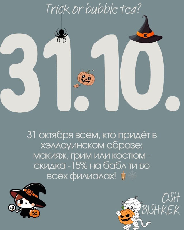 31 октября всем, кто придёт в хэллоуинском образе : макияж, грим или костюм скидка -15% на бабл ти во всех филиалах!