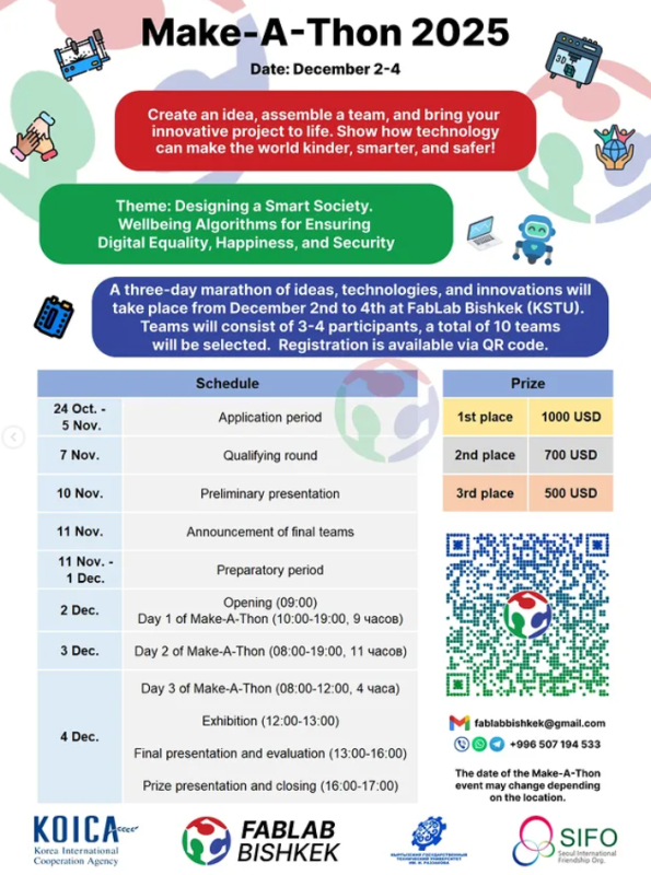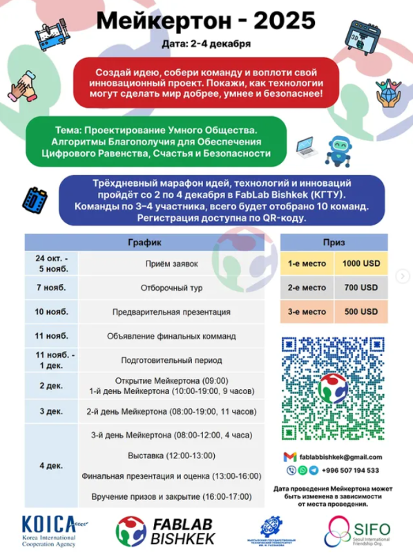 Присоединяйся к Мейкертону-2025 — трёхдневному марафону идей, технологий и инноваций, который состоится 2–4 декабря в FabLab Bishkek (КГТУ).