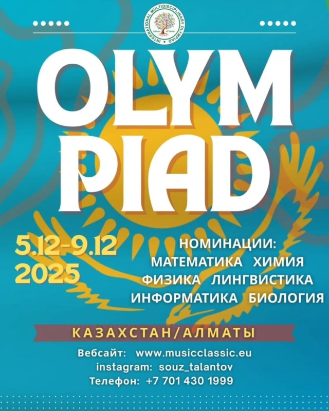 Алматы 6 и 7 декабря 2025 года встречает умников и умниц! Международная предметная Олимпиада для школьников и студентов колледжей. Гостей принимает колледж Turan. Английский,французский, русский языки с 1 по 11 класс-Оргвзнос 20000 тенге или 50 евро для граждан других стран, математика с 1-11 класс-15000(30 евро), физика 7-11 класс -15000(30 евро), биология 5-11 класс 15000(30 евро), химия 7-11 класс 15000 (30 евро), информатика 5-11 класс 15000 (30евро), менеджмент 1-4 курсы 15000 (30 евро)