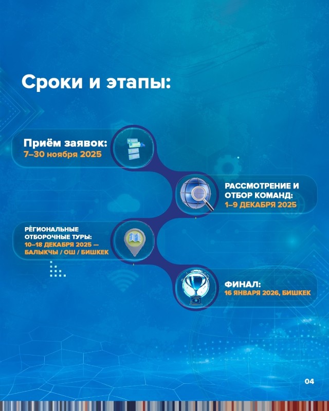 • Региональные отборочные туры: 10–16 декабря 2025 — Каракол (для восточных регионов) / Ош (для южных регионов) / Бишкек (для северных регионов)