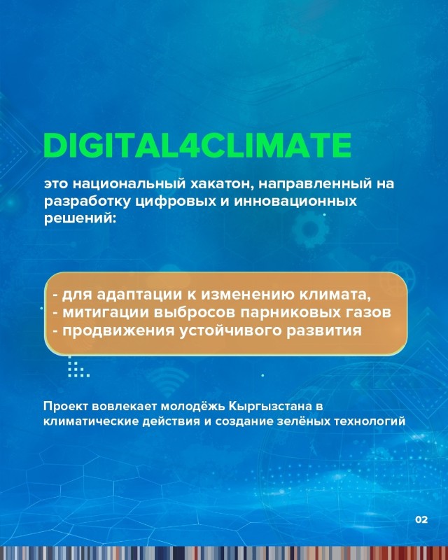 Digital4Climate — это масштабная национальная инициатива, направленная на реализацию мер ОНУВ3.0 и развитие цифровых и инновационных решений для адаптации к изменению климата и митигации выбросов парниковых газов, продвижение устойчивого развития и вовлечение молодёжи Кыргызстана в климатическое действие.