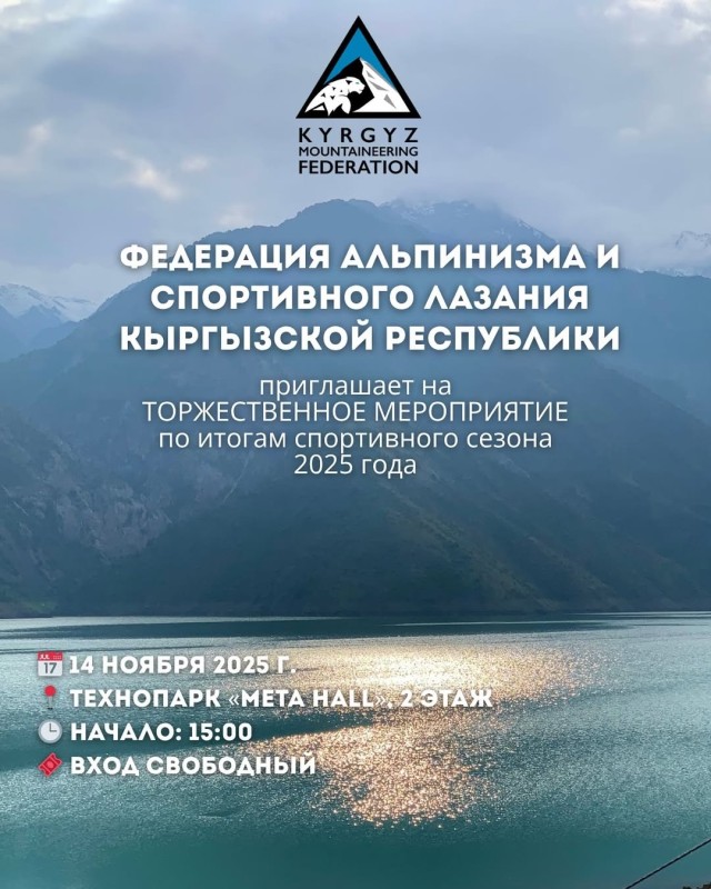 🎉 Федерация альпинизма и спортивного лазания Кыргызской Республики приглашает вас на торжественное мероприятие, посвящённое подведению итогов спортивного сезона 2025 года!