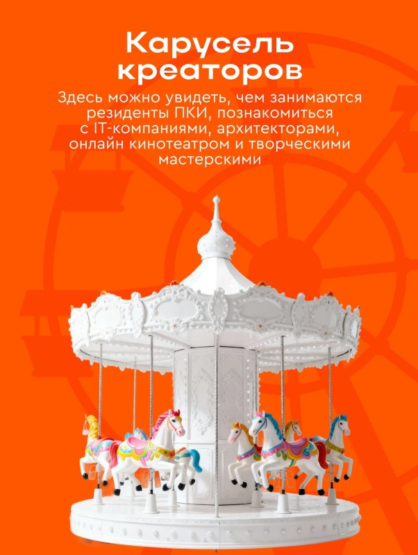 🎠 Карусель креаторов: здесь можно увидеть, чем занимаются резиденты ПКИ, познакомиться с IT-компаниями, архитекторами, онлайн кинотеатром и творческими мастерскими.